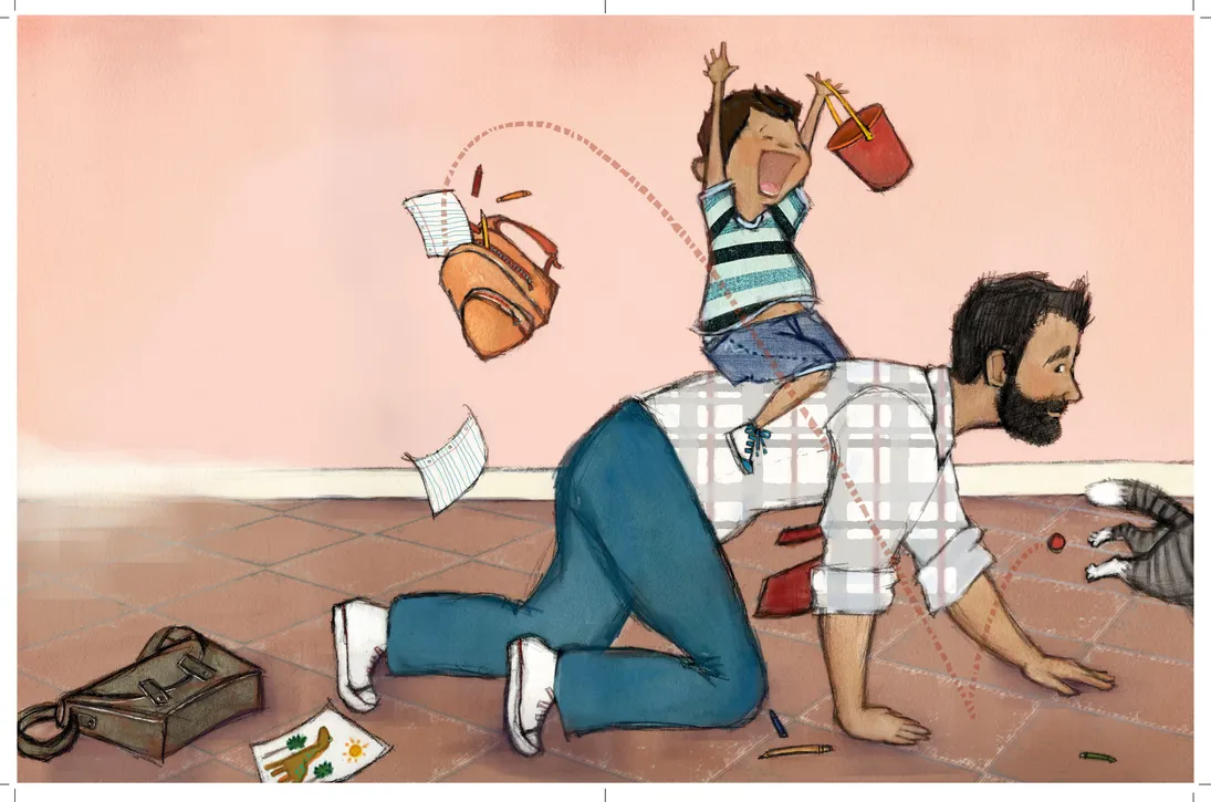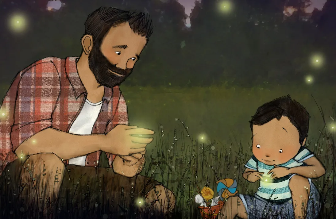 It's the Magic Hour, when the sun is going down and day meets night. As Daddy and son walk to the playground for some lively fun, they see their neighbors going through their evening rituals—watering plants, walking dogs, going for a run. As darkness sets in, Daddy and son quiet down and find fireflies, then make their way home to Mommy and bedtime.