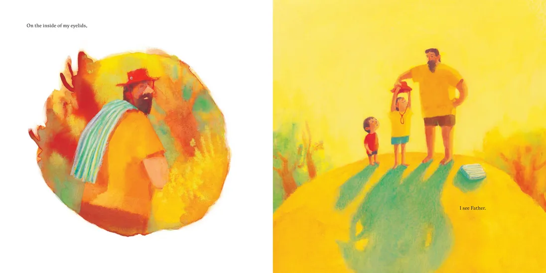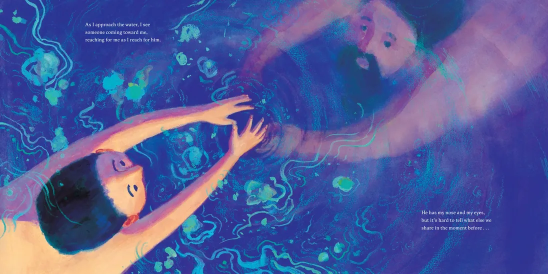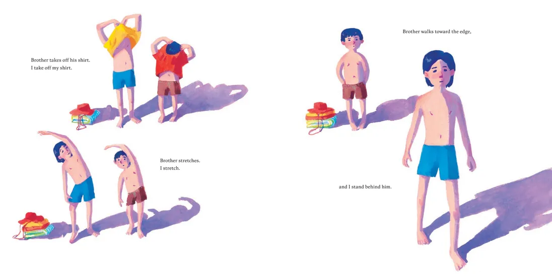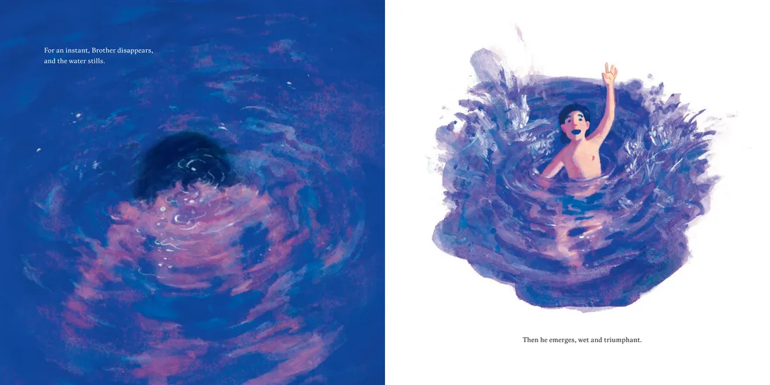On a sweltering hot day, a little boy mirrors his brother as he takes off his shirt, stretches, and walks toward the edge of the tall rock, ready to dive into the cool lake waters glistening below. Only this time, Father is not here. And the water looks so far away. How can he take the plunge?