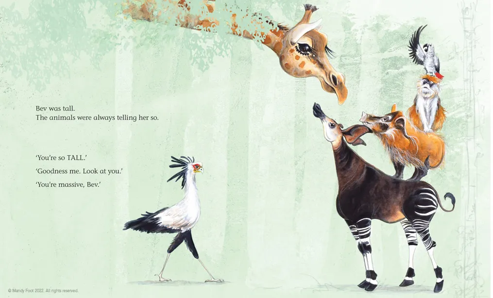 Bev is tall and Kev is small. An unlikely pair! Could this be the beginning of a very big friendship? A heart-warming tale about learning to love yourself and the value of a true friend. The artwork was created with a mixture of mediums. All the characters were traditionally painted with a combination of acrylic inks and watercolour, with details added in pencil and chalk pastel pencil. The backgrounds were created with hand textured papers, combined digitally to produce the finished artwork.