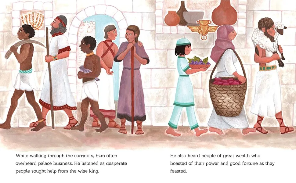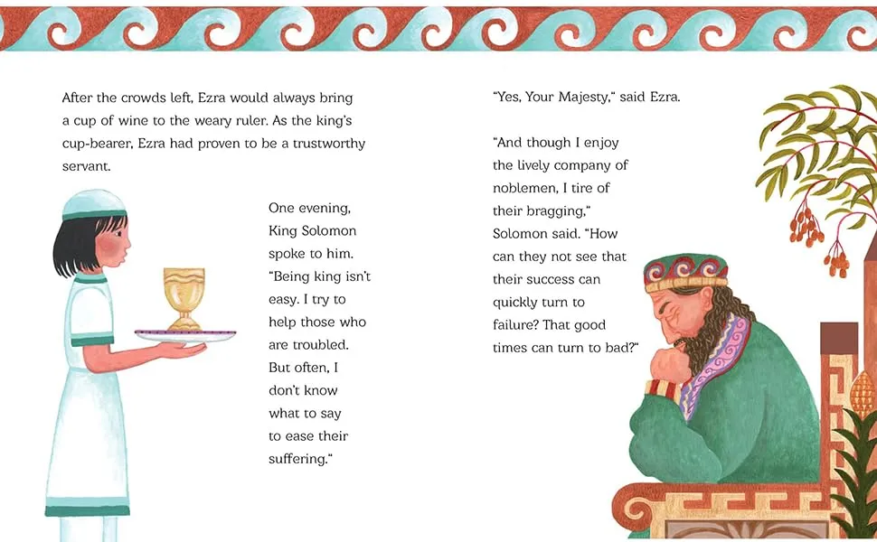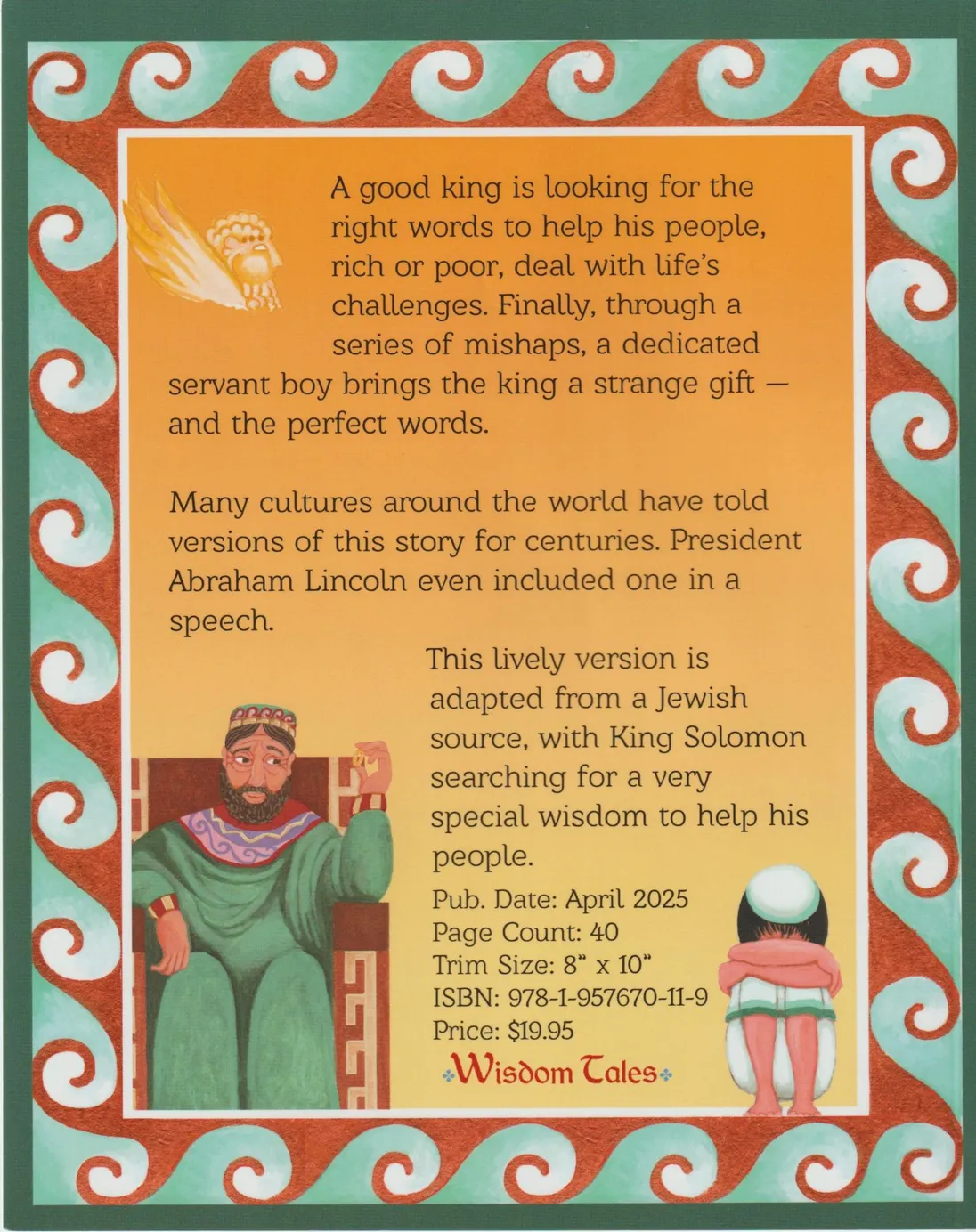 A kitchen boy named Ezra risks his livelihood to find the answer to a question posed by his master, King Solomon: “What can you say to make a sad person hopeful and a proud person humble?” Based on a legend about the Jewish king, who reigned in Israel from 970 to 931 BCE, this ancient story is retold from a child’s perspective to bring comfort and wisdom to a new generation of readers.