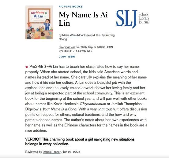 PreS-Gr 3–Ai Lin has to teach her classmates how to say her name properly. When she started school, the kids said American words and names instead of her name. She carefully explains the meaning of her name and how it fits into her culture. Ai Lin does a beautiful job with the explanations and the lovely, muted artwork shows her loving family and her joy at being a respected part of the school community. This is an excellent book for the beginning of the school year and will pair well with other books about names like Kevin Henkes’s Chrysanthemum or Jamilah Thompkins-Bigelow’s Your Name is a Song. With a very light touch, it offers discussion points on respect for others, cultural traditions, and the how and why parents choose names. The author’s notes about her own experiences with her name as well as the Chinese characters for the names in the book are a nice addition. VERDICT This charming book about a girl navigating new situations belongs in every collection.