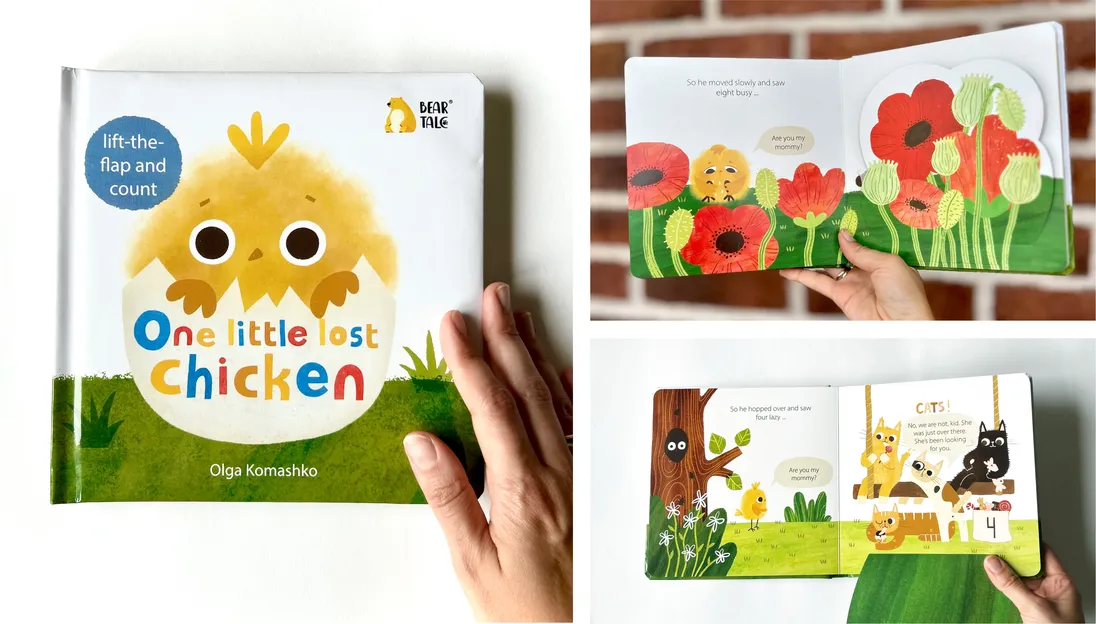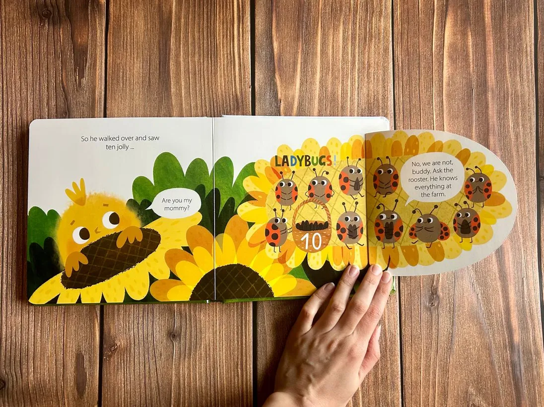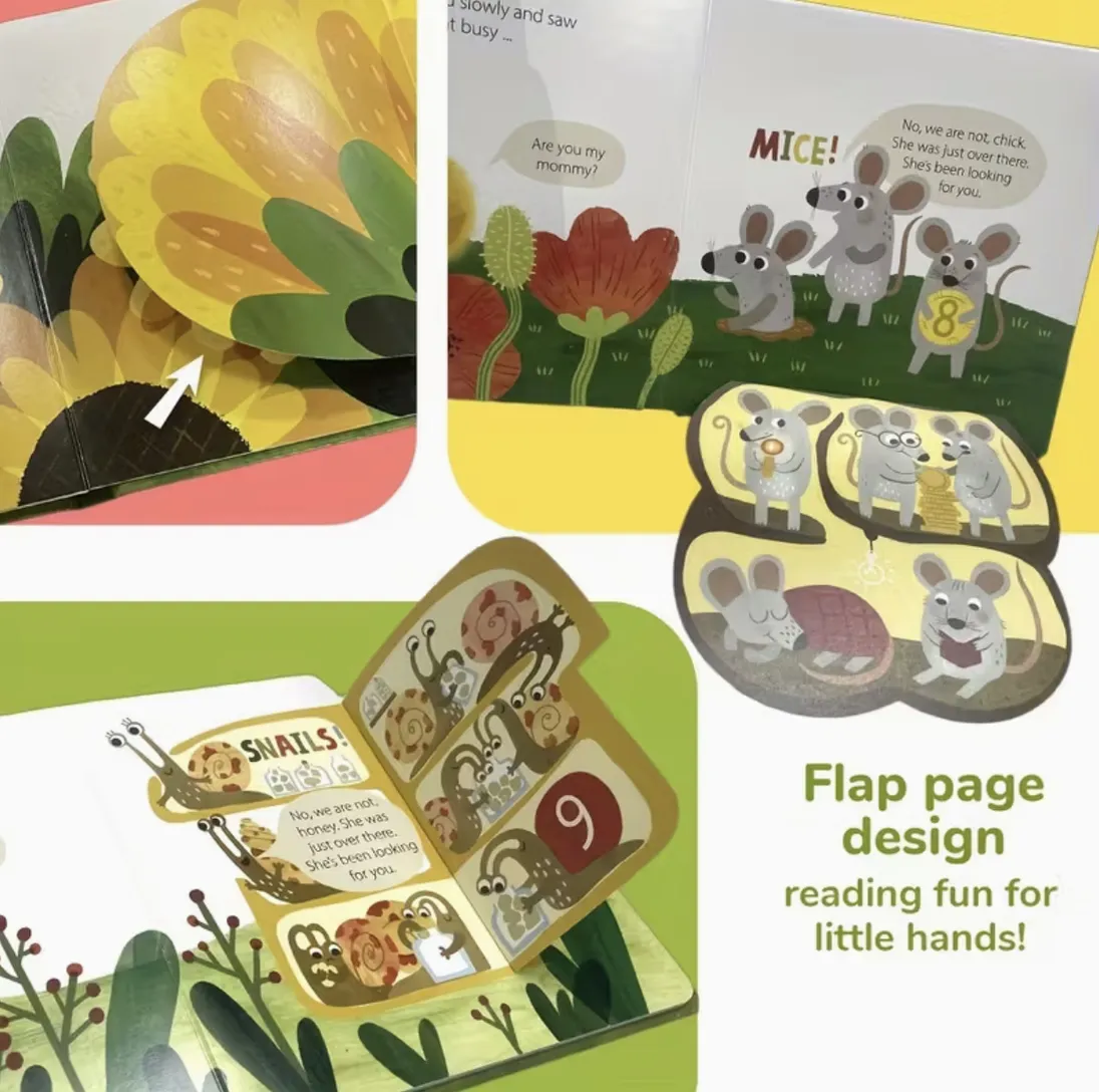 Join a curious little chicken on a heartwarming journey to find his mother! Along the way, lift the flaps to discover friendly animals hiding on every page - 2 big cows, 3 serious dogs, and more, all the way up to ten. With sturdy flaps perfect for little hands and cheerful surprises behind every one, this interactive book makes learning to count from 1 to 10. A joyful adventure for curious toddlers!