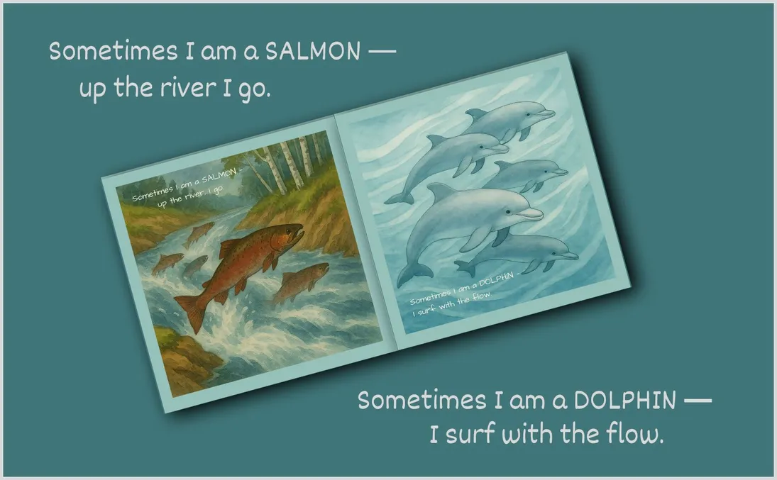 A poetic journey through the wisdom of animals—helping children understand their emotions, their nature, and their inner strength. An eagle soars high and visible, but the mouse knows when it is best to stay hidden. A dolphin rides an ocean wave effortlessly, but the salmon knows how to fight upstream when necessary. Every animal brings its own message and strength—and so do we. Sometimes I Am an Eagle, Sometimes I Am a Mouse is a beautifully illustrated animal emotions book for kids, designed to help children explore their feelings through the gentle lessons of nature. This mindfulness picture book invites readers to see that all emotions—joy, fear, courage, stillness, energy—have their purpose and place. Children discover that they can be many things: brave like a wolf, playful like an otter, patient like a tortoise, or confident like an elephant. By connecting with these qualities, they learn to honor who they are and to notice how they change from moment to moment—just like the natural world around them. Each page pairs a graceful watercolor animal illustration with simple, resonant text, creating a calm and contemplative reading experience for children and adults alike. Whether read aloud at bedtime, used in the classroom, or shared during quiet reflection, this nature-themed children’s book opens the door to meaningful conversations about identity, emotions, and empathy.
