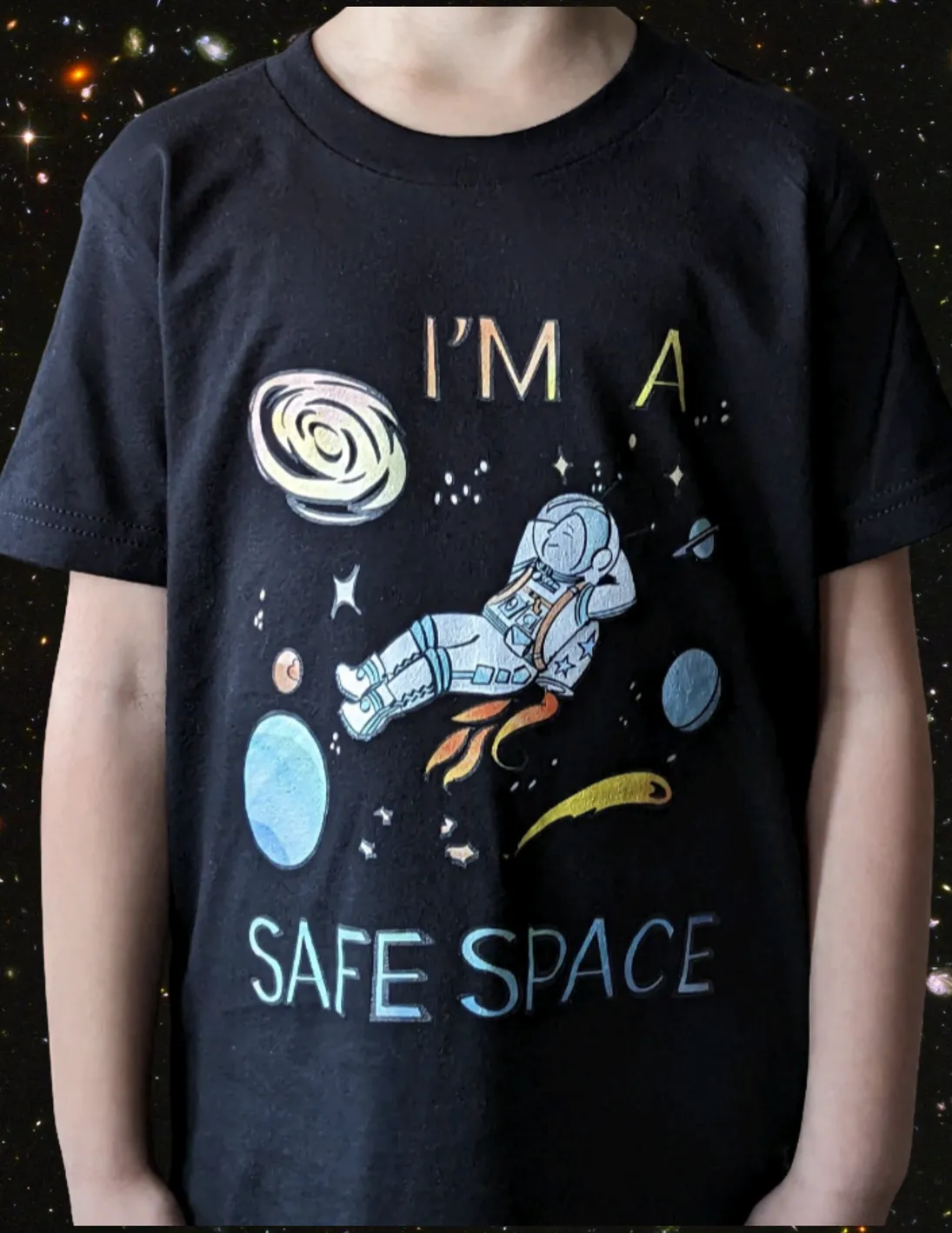For kids: tees in toddler & youth sizes, hoodies in youth sizes For grown-ups: tees and hoodies in sizes up to 5XL Stevie’s wearable-advocacy brand, Stevie’s Safe Spaces, produces trans-rights tees and more, and works with individual sponsors to make them available to those with cash barriers.