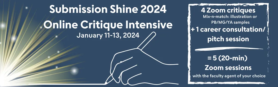 Event Description: So, you have a handful of manuscripts or illustration styles ready to query. Which one should you lead with? Is your other work strong enough to hook an agent if they request to see more? And what will an agent think about the variety of work you bring? Whether you have multiple submission-ready picture book manuscripts, write across age categories, have a variety of illustration pieces and illustrated works, or a combination of all of the above, Submission Shine is an opportunity to talk with one agent about four submission-ready works AND your writing/illustrating career as a whole. Plus, a webinar to help center your confidence as you begin querying AND additional feedback from a peer critique group of other Submission Shine participants.